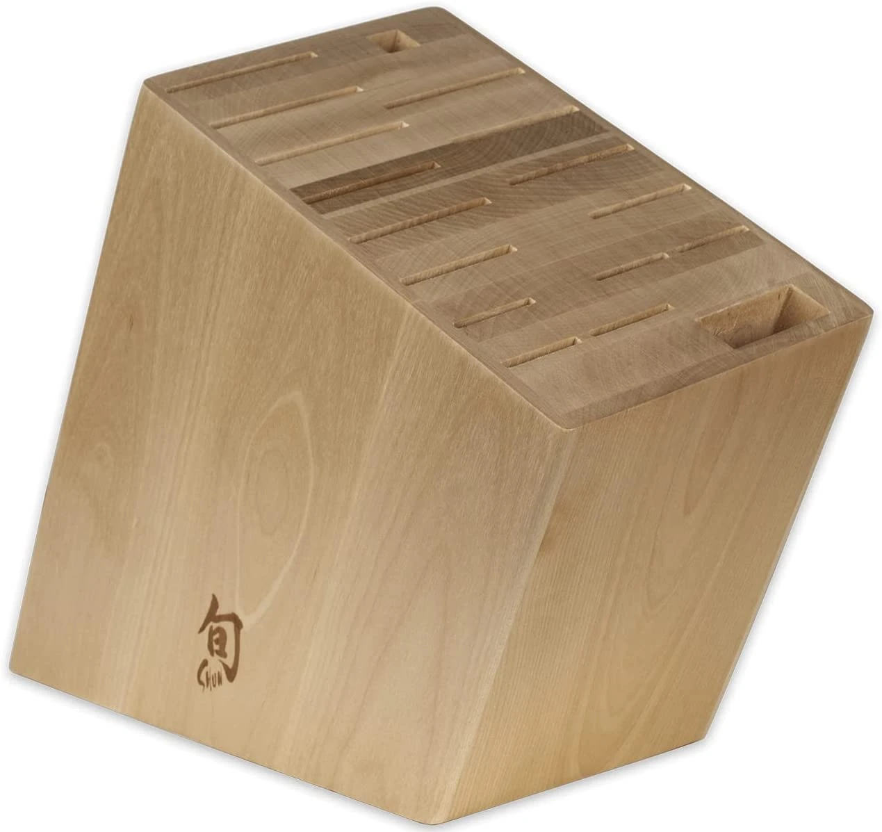 The Beech 17-slot block offers room for your expanding Shun collection. This solid wood block works beautifully with a variety of Shun series styles. This handsome block features 17 slots, including one to accommodate a honing steel and one for a handy pair of kitchen shears. – DM0850 – 7 – W30