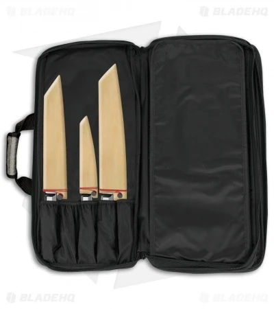 It can hold up to 20 knives securely in its sleeves. This knife roll has a full zipper closure and Velcro closures as well. The nylon, over-the-shoulder strap is heavy duty and the handles are padded to make carrying hassle-free. It is made from durable polyester.