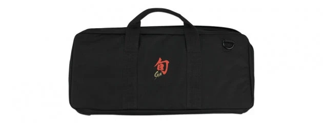 The Shun 20-Slot Knife Case is the safe and secure way to travel with your knives. It provides space for up to 20 knives in secure elasticized pockets. Rigid supports inside the case resist crushing and ensure your knives are well protected. Another section of the case has three zippered net pockets, ideal for any non-bladed kitchen tools that are part of your traveling kit. The exterior of the case has a business card carrier for easy identification. The case is made of PVC-laminated 600 denier woven polyester with heavy-duty nylon straps. It is fully zippered, has Velcro closures, and offers a padded, reinforced handle. A separator panel in the larger sections helps guard against scratching during transport. D-rings on either side of the case accommodate a heavy-duty carry strap. Embroidered with the Shun logo in red and gold, the Shun 20-Slot Knife Roll is the easiest and most secure way to travel with your knives.