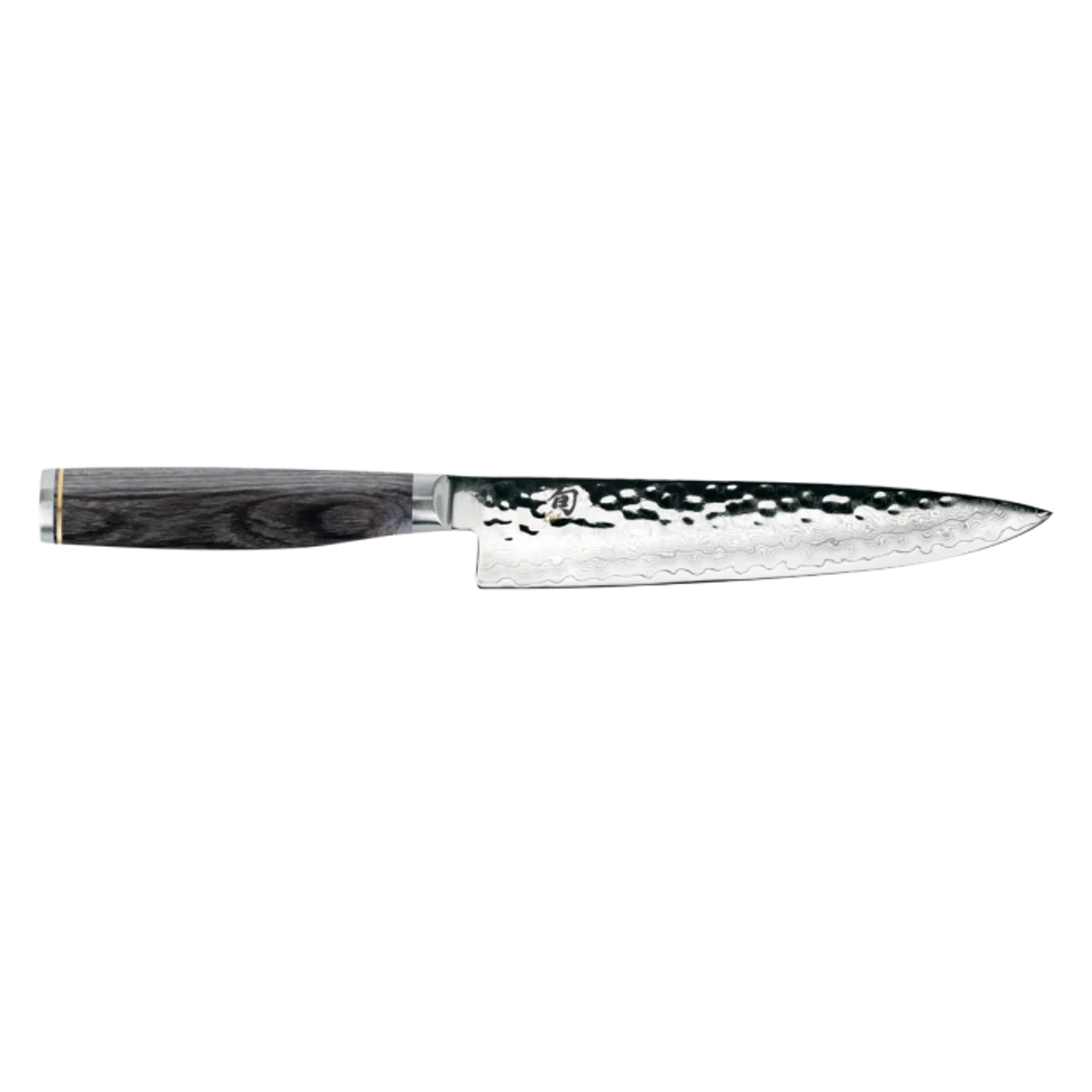 A utility knife is the third member of your must-have triad of kitchen knives. With its 6.5-inch blade, the Shun Premier Grey Utility Knife is between a chef’s knife and a paring knife in size. It is ideal for all those in-between-sized tasks, from trimming vegetables to slicing sausages. For any job that takes precision, the utility knife is a top choice. Sophisticated, grey Pakkawood handles and a razor-sharp edge enables you to make quick work of a wide range of cooking tasks—using a gorgeous knife that you will enjoy using every time.