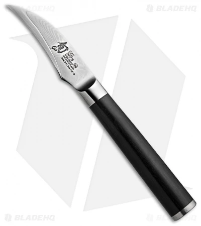 The Shun Cutlery Bird’s Beak Knife features a VG-Max “super” steel blade core clad with 34 folded layers per side of stainless Damascus steel. The blade is ground and bead blasted to reveal the beautiful flowing pattern of the Damascus. It features a D-shaped Ebony PakkaWood handle, which is resin-impregnated natural hardwood designed for moisture resistance and longevity. While the D-shaped handle is designed specifically for right-handed use, left-handed users may find it comfortable in hand as well. Shun does sell select left-hand specific handles in the reverse grip.