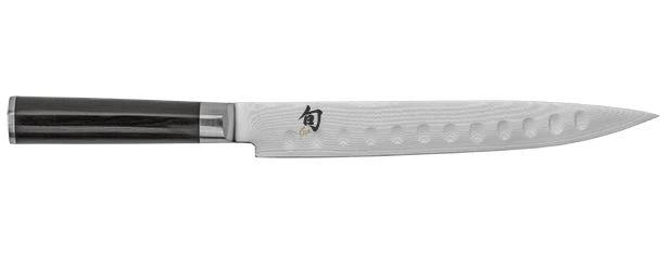 The Shun Classic Hollow-Ground Slicing Knife is part of the Shun Classic line of tasteful and contemporary cutlery. The Shun Classic line features beautiful Damascus-clad blades and D-shaped ebony PakkaWood® handles. Yet behind these handcrafted knives’ beauty is function: razor-sharp blades offering top performance. Shun’s proprietary high-performance VG-MAX steel, which provides incredible edge retention, is clad with Damascus stainless steel, then ground and bead-blasted, revealing the flowing pattern of the layered steel. The result is a line of knives that are sharp, durable, and corrosion resistant, as well as beautiful to behold. The Shun Classic line also offers you the widest assortment of both traditional culinary blade shapes and cutting-edge designs, so you can always find the right knife for the task.