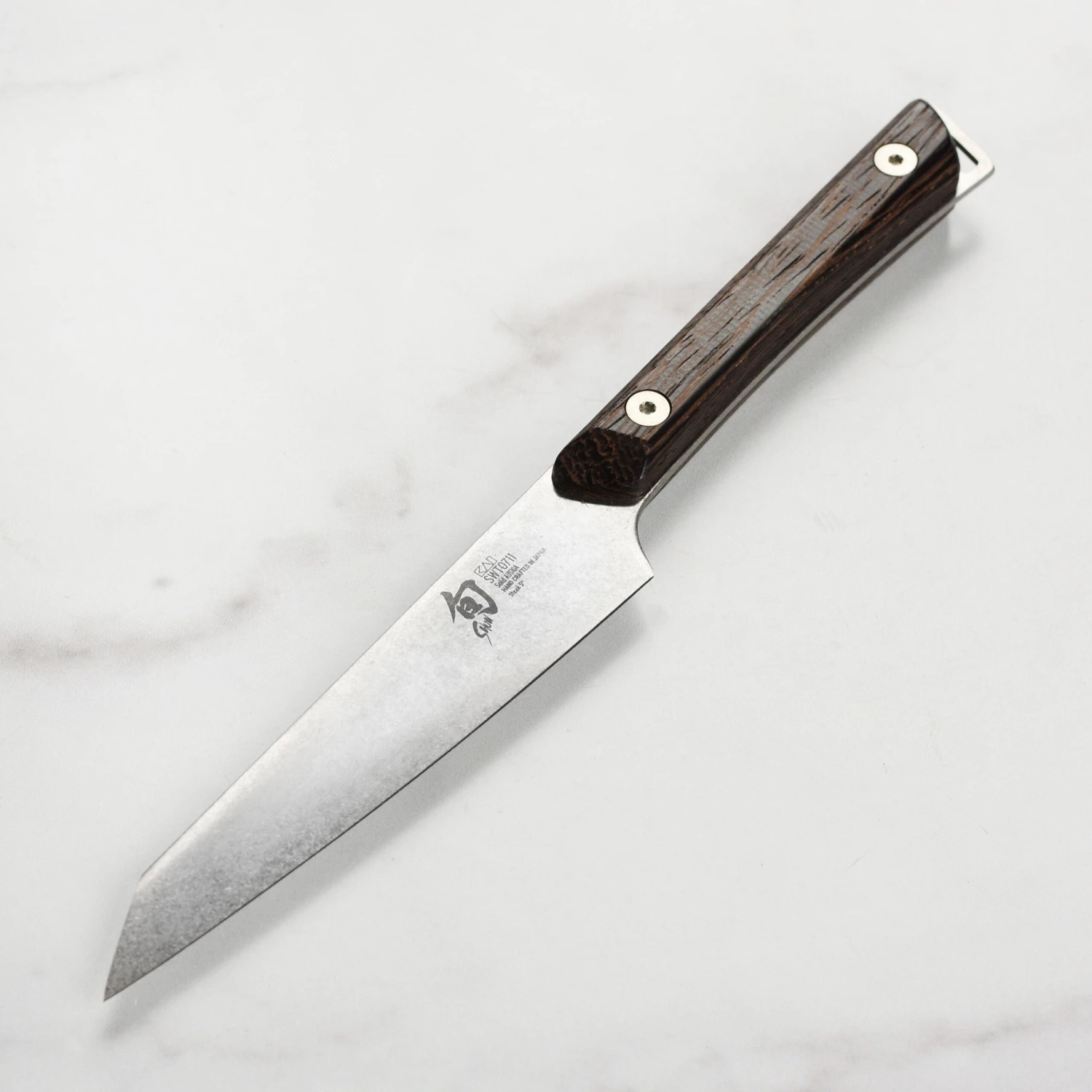 - 60 Rockwell rating in hardness; hand-sharpened 16° double-bevel blade