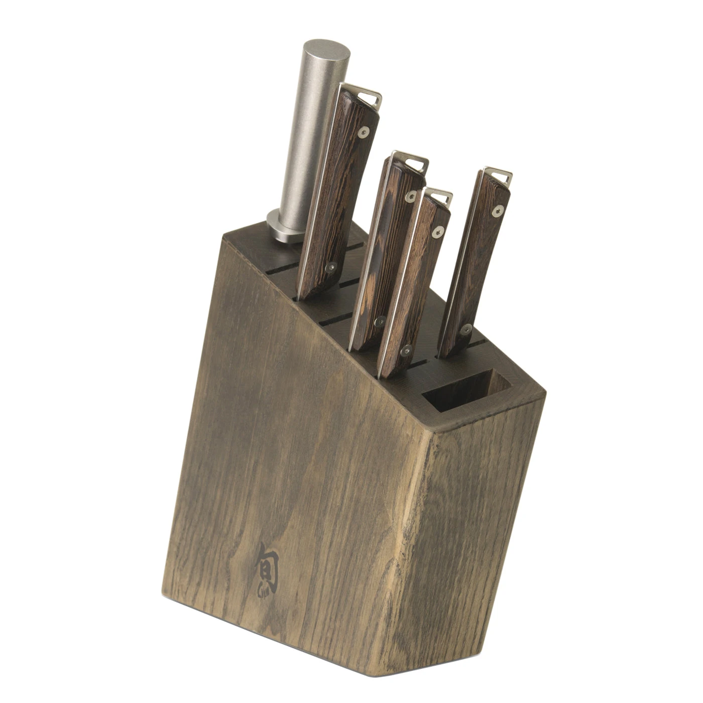 The Kanso 6-piece block features five key pieces of kitchen cutlery, plus a beautiful block with a finish to match the Kanso handle. You get the Kanso 8-inch Chef’s Knife, 5.5-inch Hollow-Ground Santoku, 6-inch Utility Knife, 3.5-inch Paring Knife, and the Kanso Combination Honing Steel. They all fit in the solid wood block—with room to expand. There are two additional slots, plus one to accommodate a handy pair of kitchen shears.