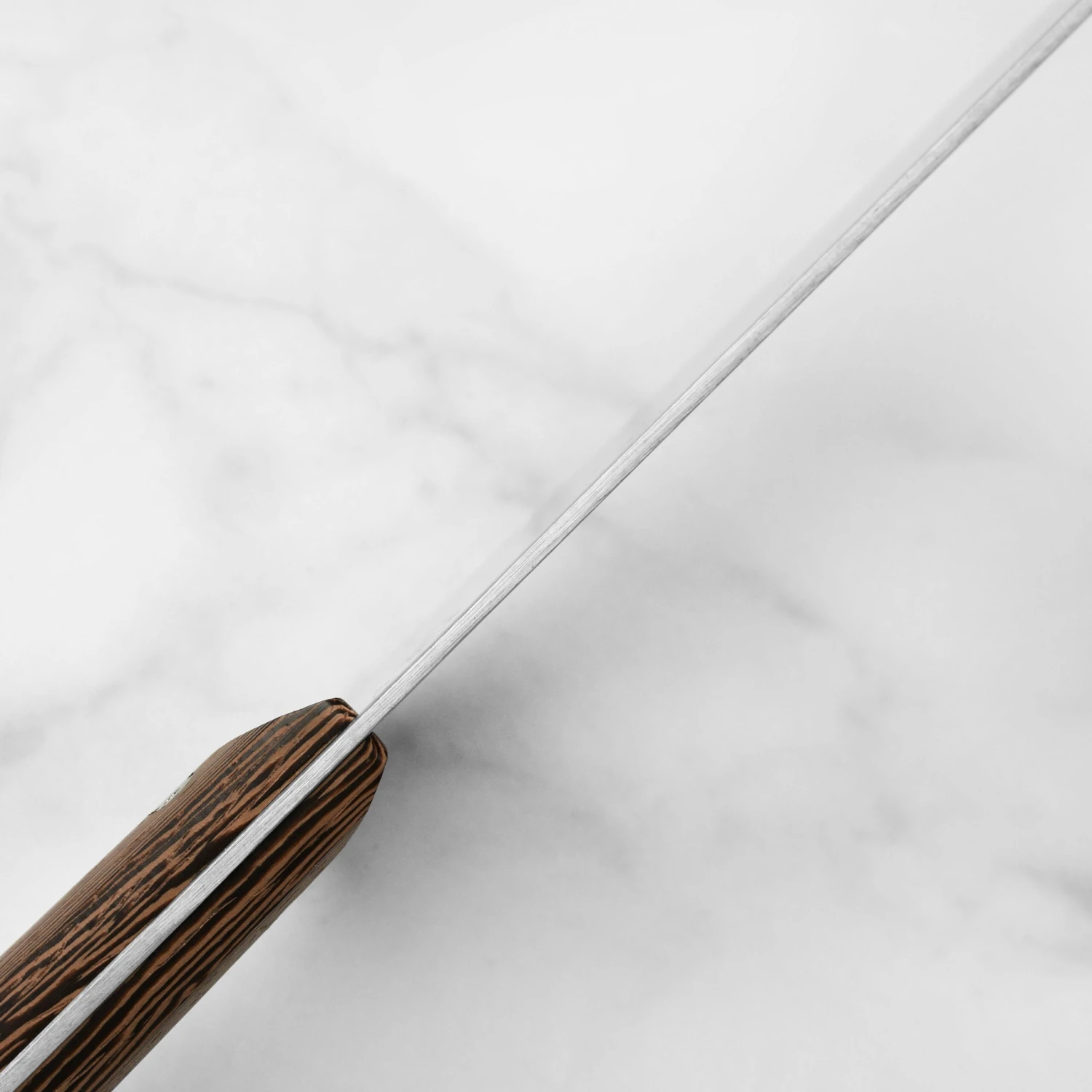 - 60 Rockwell rating in hardness; hand-sharpened 16° double-bevel blade