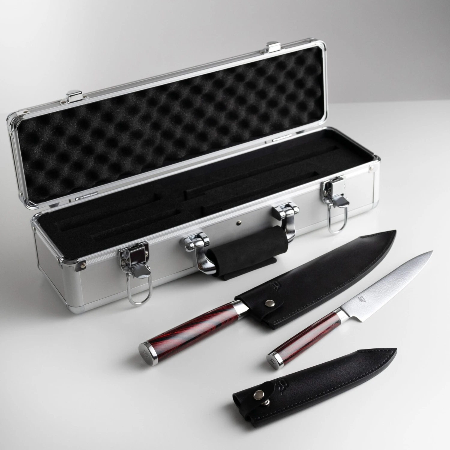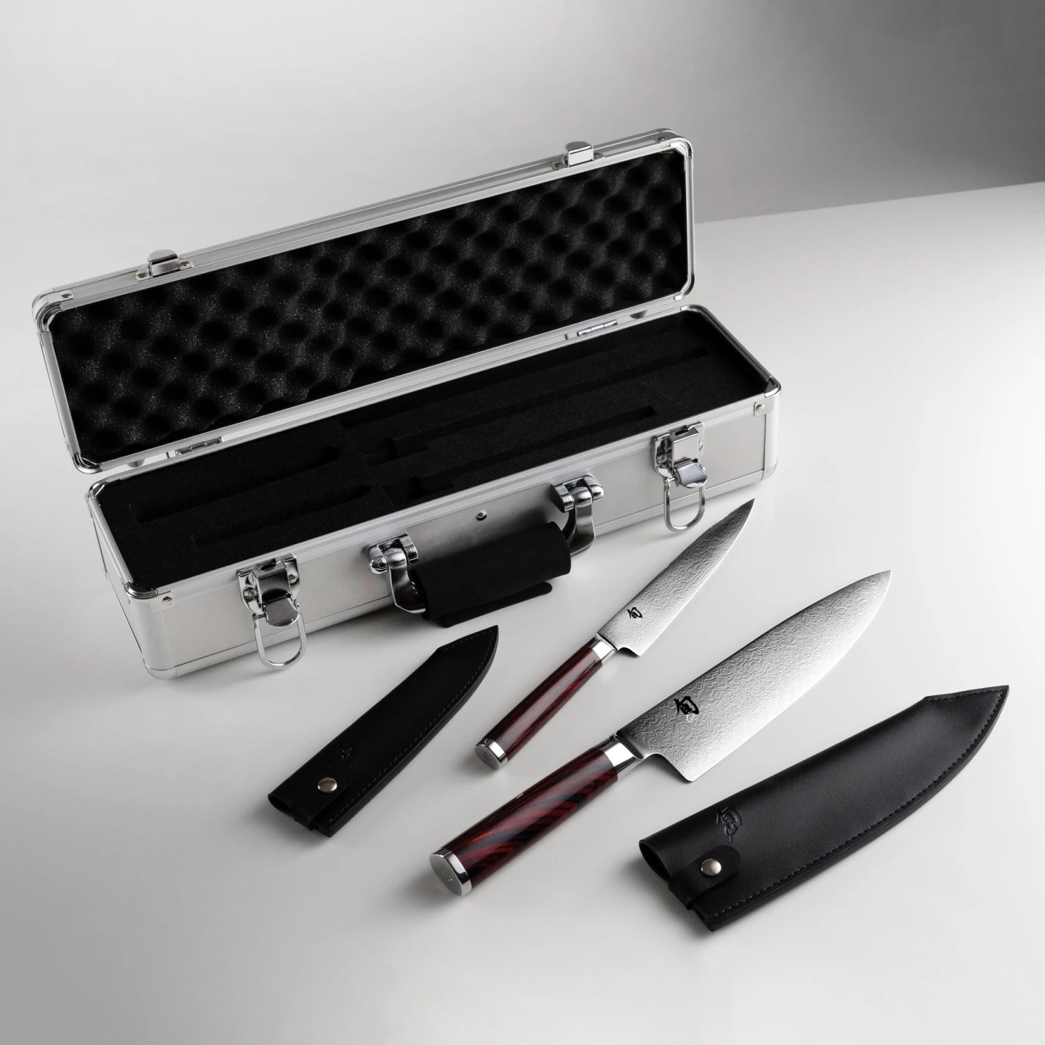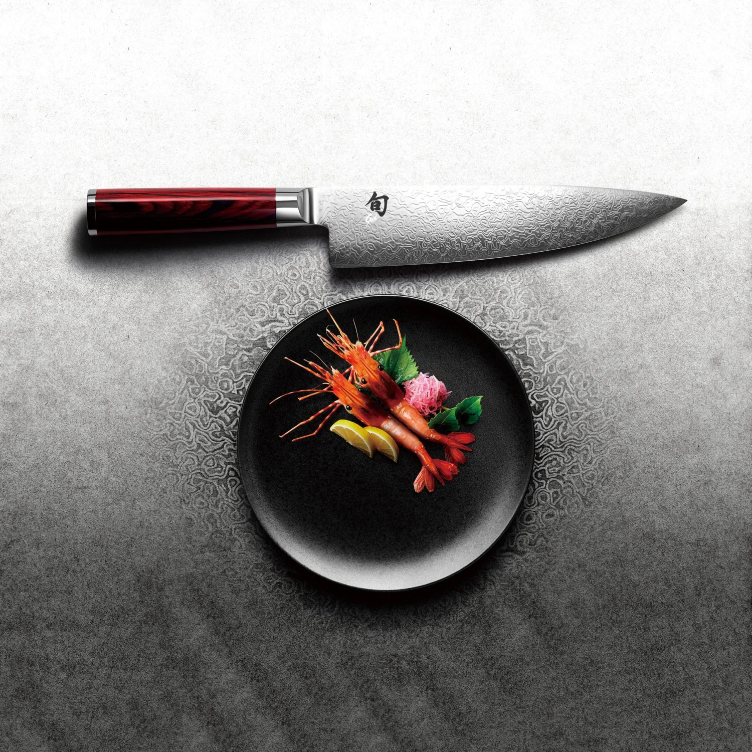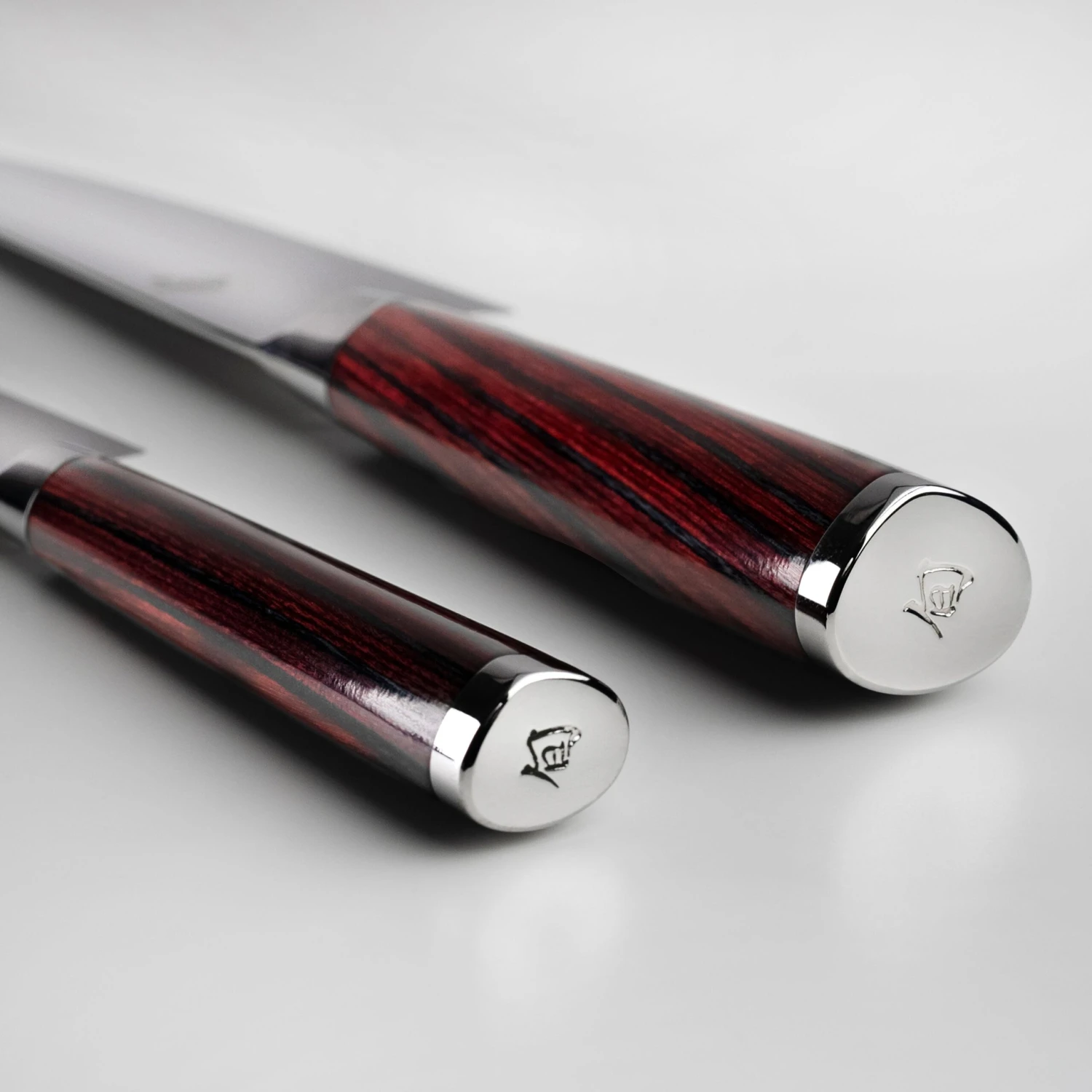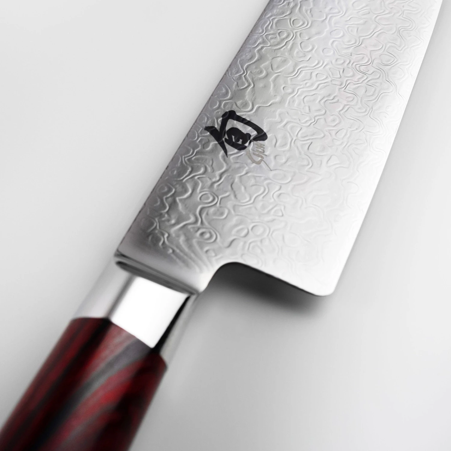 - High-polished red and black Pakkawood D-shaped handles with stainless steel bolster and end-cap with embossed Shun logo