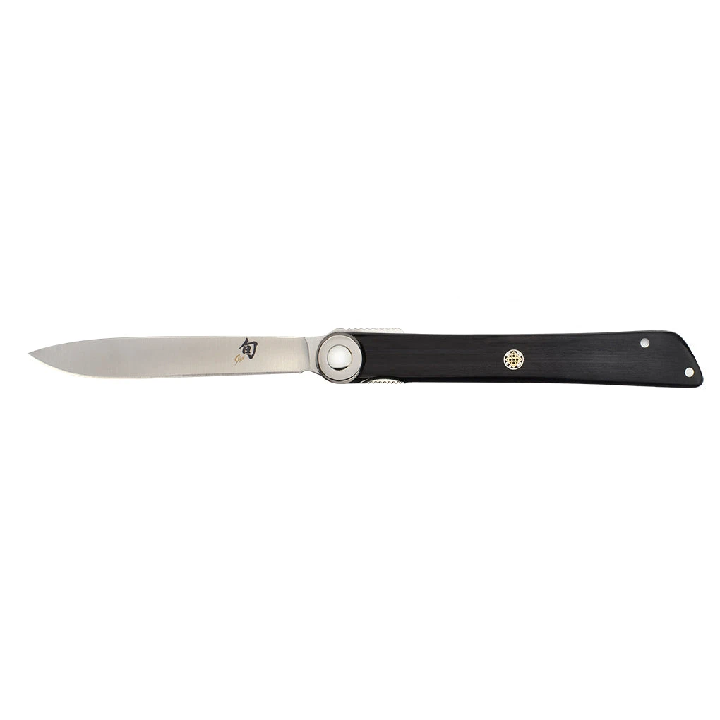 The Shun Large Higo-No Kami includes the traditional lever for easy one-handed opening. However, Shun has also made a number of refinements on the original design. For example, the traditional knife did not include a locking system. The Shun Higo-No Kami does. A locking liner secures the blade open when in use so it cannot accidentally close, endangering the user’s fingers. The VG10 “super steel” blade is slim and razor-sharp, making it perfect for use as a personal steak knife and perhaps provoking a little envy from your dining companions. The Shun Large Higo-No Kami is nine inches long when opened and folds to just five and a half inches when closed. The ebony PakkaWood handle features an inlaid mosaic crest. This slender, lightweight knife fits nicely into a suit pocket and includes a sumptuous leather sheath. Whether purchased for yourself or as a gift, the Higo-No Kami is a possession of understated elegance.