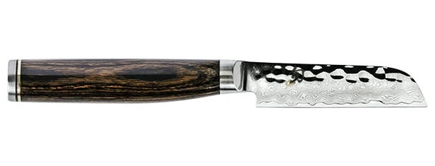 The vegetable knife is one of the key variations of the paring knife. The Shun Premier Vegetable Knife is about the same size as a traditional paring knife, but it has a down-turned tip (sometimes known as “sheepsfoot”) and a straight edge. The edge is especially convenient when cutting carrots or zucchini into disks directly into the cooking pot, as well as for smaller tasks such as trimming vegetables. Since the flat edge makes complete contact with the cutting surface, it also makes it easy to chop herbs and smaller vegetables on a chopping board.
