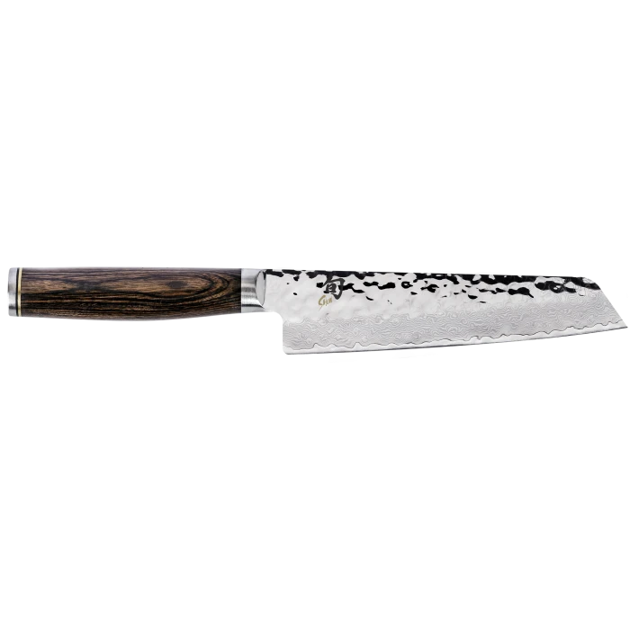 The ultra-versatile Shun Premier Master Utility combines the nimbleness of a utility knife with the do-it-all capabilities of a chef’s knife. The blade is slightly longer and significantly wider, so you can easily accomplish a wide range of food preparation tasks while enjoying the ease of use and agility of a compact knife. Extra width at the heel and a slightly curved belly enables rocking cuts to easily mince herbs and spices. A larger handle gives you a secure, comfortable, and confident grip as you work. The Shun Premier Master Utility’s downturned tip (similar to a kiritsuke) is extra durable. Slice, dice, shred, or portion; you can do it all with this one very beautiful, very functional, kitchen knife.