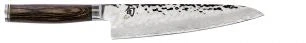 The Shun Premier 7-in. Asian Cook’s Knife is part of the beautiful Shun Premier line, which calls to mind the hand-forged knives of ancient Japan. While each knife still takes at least 100 handcrafted steps to complete, the materials Shun uses are among the most advanced in the industry. Each blade has a cutting core of Shun’s proprietary VG-MAX “super steel” to take and hold a precision edge. The layered Damascus cladding supports the core and provides additional stain resistance. Near the edge of the blade, where the steels meet, an undulating line is formed—similar to the hamon formed when samurai swords are tempered using a traditional clay-baking technique. The hammered tsuchime finish acts like a series of hollow-ground cavities to reduce drag. The handles nestle comfortably in the hand, while the embossed end cap adds balance and beauty.
