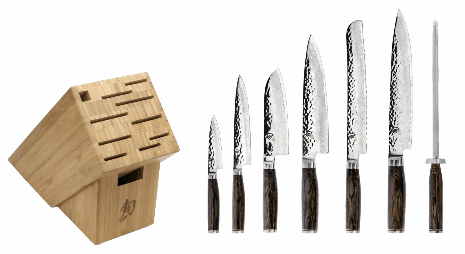The Shun Premier 8-piece Professional Set is part of the beautiful Shun Premier line, which calls to mind the hand-forged knives of ancient Japan. While each knife still takes at least 100 handcrafted steps to complete, the materials Shun uses are among the most advanced in the industry. Each blade has a cutting core of Shun’s proprietary VG-MAX “super steel” to take and hold a precision edge. The layered Damascus cladding supports the core and provides additional stain resistance. Near the edge of the blade, where the steels meet, an undulating line is formed—similar to the hamon formed when samurai swords are tempered using a traditional clay-baking technique. The hammered tsuchime finish acts like a series of hollow-ground cavities to reduce drag. The handles nestle comfortably in the hand, while the embossed end cap adds balance and beauty.