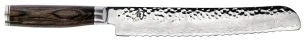 If you bake or buy whole loaves of bread, a bread knife will be one of the most-used knives in your kitchen. Whether you love wonderfully crusty or delicately tender bread, the Shun Premier Bread Knife will be your loaf’s new best friend, no matter what its texture. The key is Shun’s razor-sharp, wide, “low frequency” serrations. Unlike a plain-edged knife, the serrations let you gently saw through the bread without crushing and with much less crumbing. Unlike sawtooth serrations that are spaced closer together, the Shun Premier Bread Knife’s wide serrations will gently glide through the bread without tearing. This keeps the bread’s texture intact and enhances eating pleasure. Cakes and pastries also benefit from the Shun Premier Bread Knife’s smooth cutting capabilities.