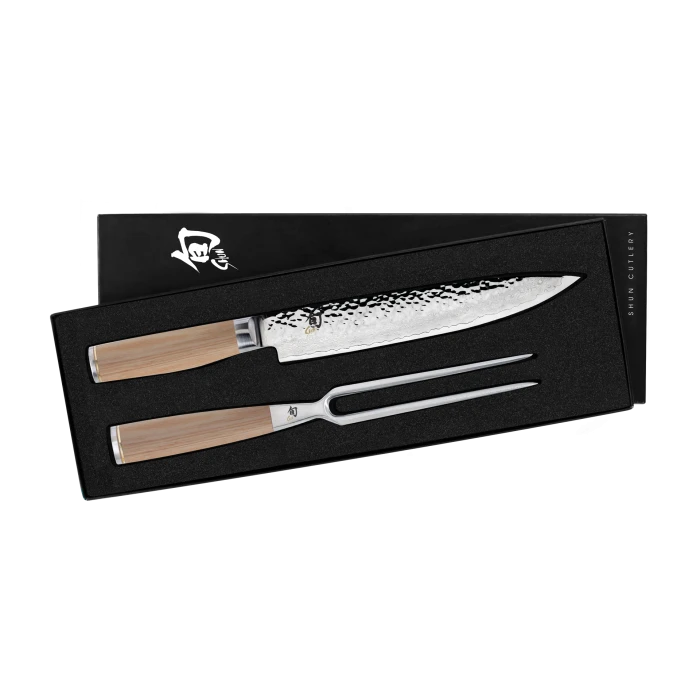 The Shun Premier Blonde 2-Piece Carving set includes our matched 9.5-in. Slicing Knife and Carving Fork in a boxed gift set. With these beautiful culinary tools, you will be able to achieve thin, even slices every time. The Shun Premier Blonde Carving Set will look simply stunning when used in presentation carving or will make a gorgeous addition to your holiday table. This set also makes a thoughtful gift. Slicing knife: VG-MAX cutting core; the latest in the VG line of “super steels”; wear resistant, corrosion resistant, holds a fine, sharp edge; 16° each side 68 micro layers of Damascus cladding look beautiful, support and protect the core. Hammered TSUCHIME finish helps release food easily when cutting. Beautiful, blonde Pakkawood handle is contoured for comfort and control; resists moisture. Handcrafted in Japan. Carving fork: Stainless steel tines for easy care. Blonde Pakkawood handle provides a secure grip. Components from China, Assembled in Japan. – TDMS0200W – 2 – B179
