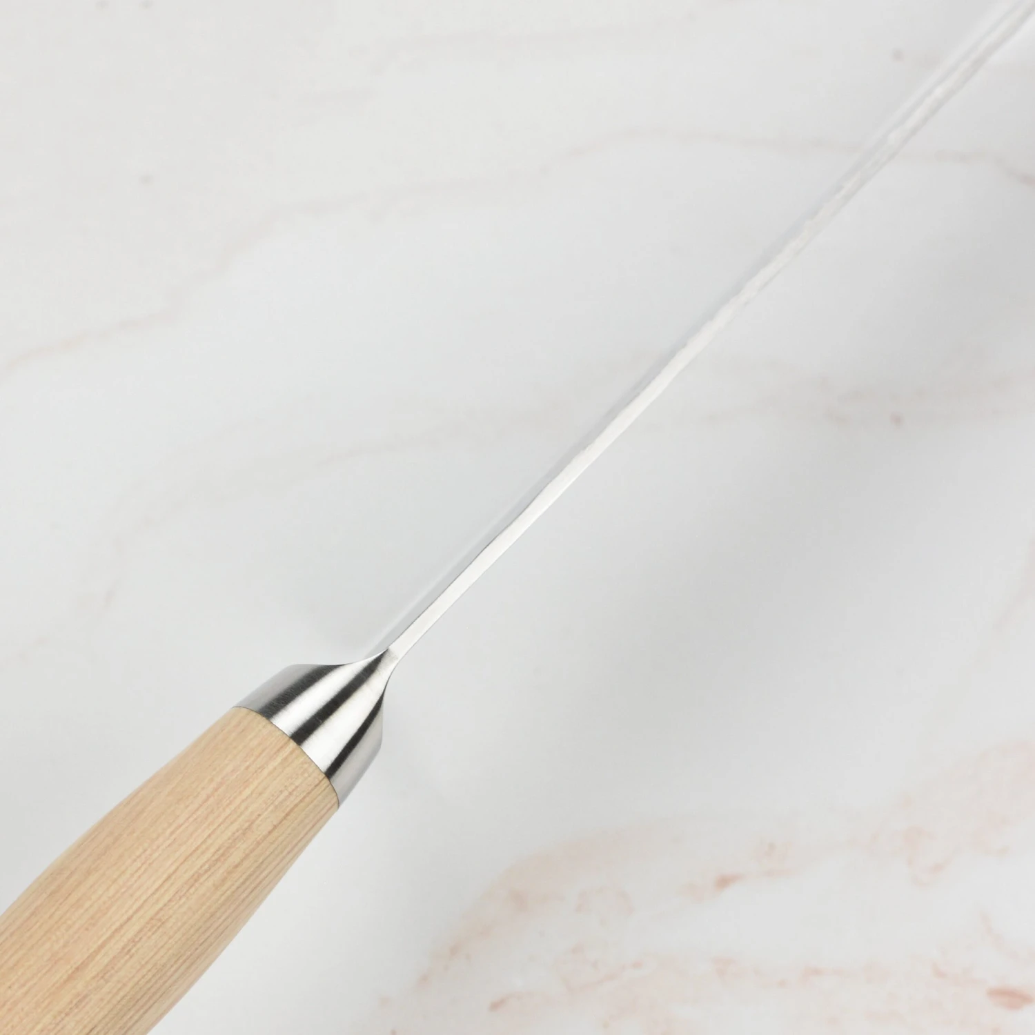 - Contoured blonde PakkaWood handle accommodates right and left-handed users