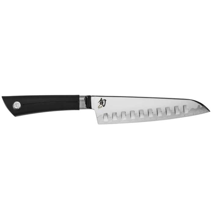 A santoku is an Asian-inspired knife that many cooks today have added to their kitchen favorites. A knife of many talents, a santoku easily handles all the basic kitchen cutting tasks. Slightly shorter than the standard chef’s knife, the Shun Sora Hollow Ground Santoku is light, agile, and very easy to maneuver. There’s just enough belly curve to enable rocking cuts, which just adds to the this santoku’s versatility. The hollow-ground indentations on the side of the blade create small air pockets that reduce friction when cutting, making it easier to glide through each cut.